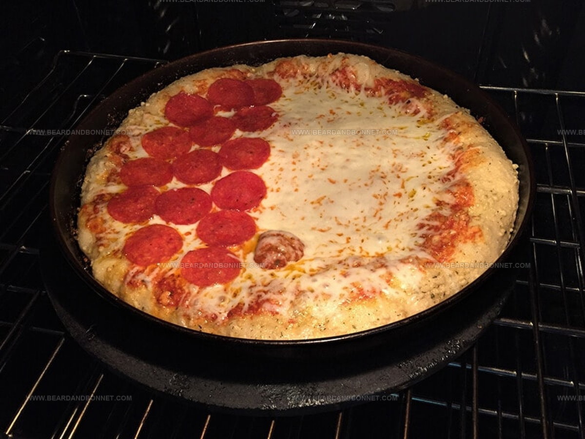After that, top your pizza with mozzarella cheese, tomato sauce, and all your favorite ingredients. Finally, place the pan in a preheated oven and bake at 400°F (204°C) for about 15 minutes until golden and bubbly.