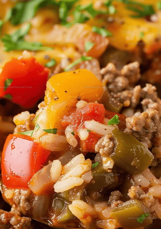 Packed with robust flavors and simple ingredients, the dish combines tender peppers, seasoned ground beef, and melted cheese in one delightful pan.