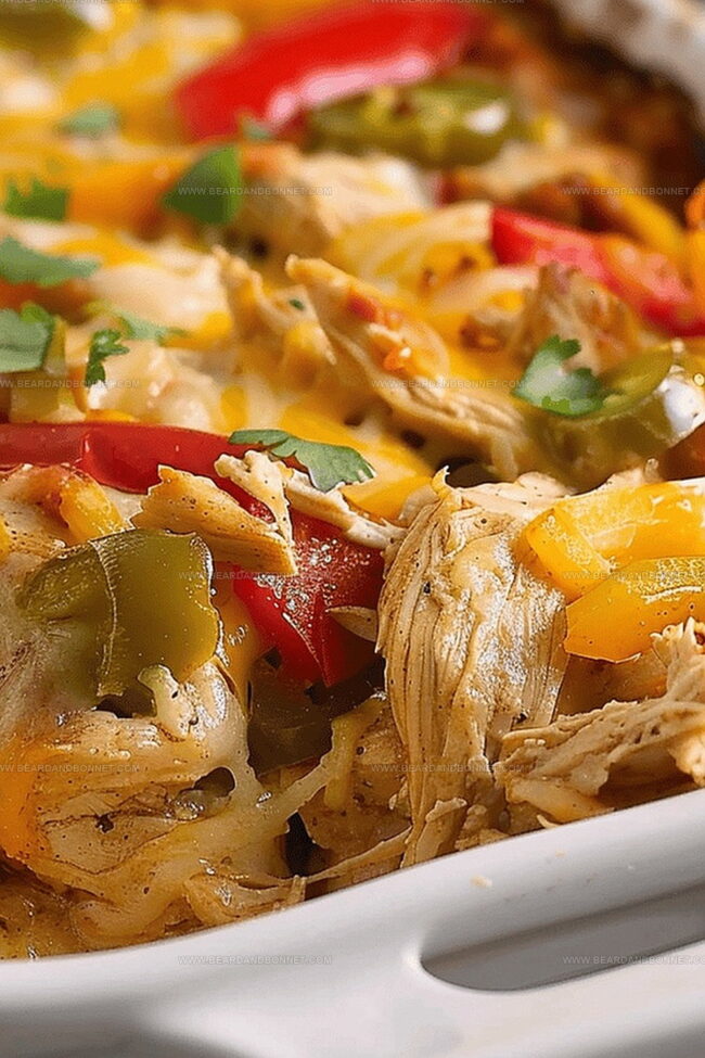 Chicken fajita casserole brings Tex-Mex comfort to dinner tables with layers of zesty flavors and cheesy goodness. Spicy chicken, colorful peppers, and melted cheese create a satisfying meal that will make diners crave seconds.
