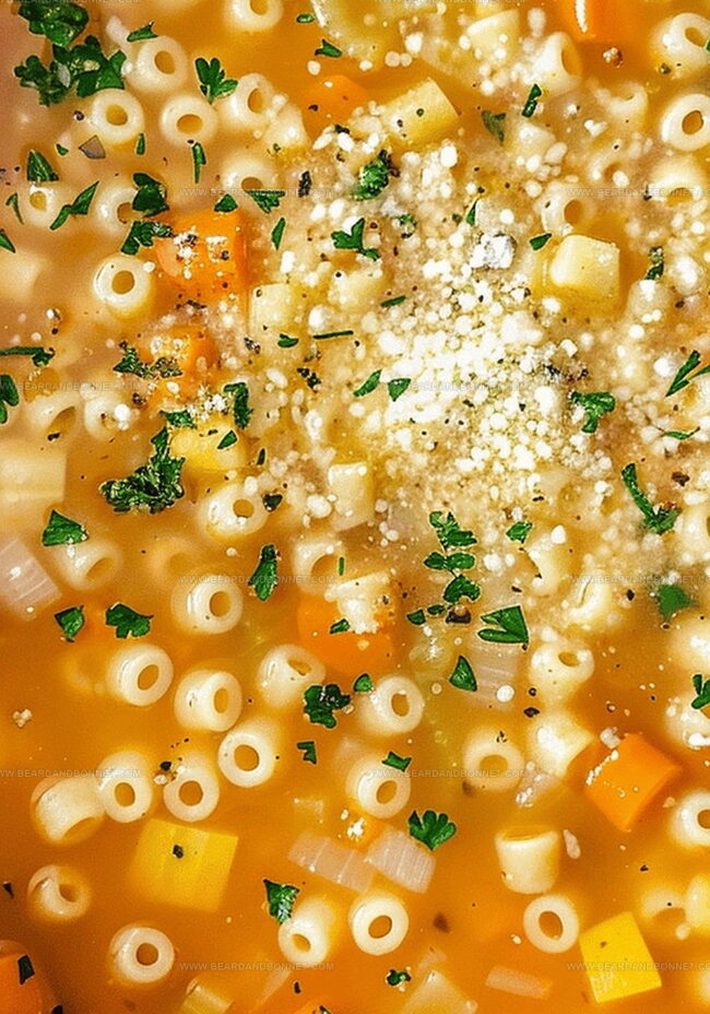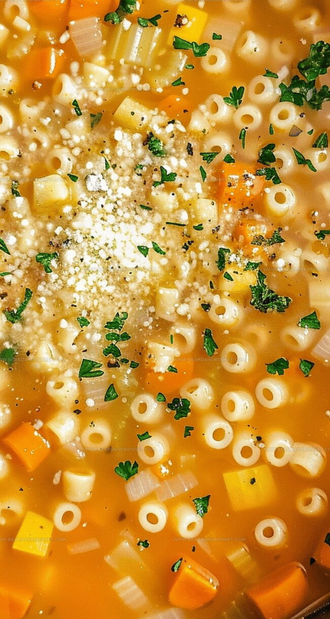 Soft pastina absorbs the rich vegetable broth, making every bite a comforting embrace.