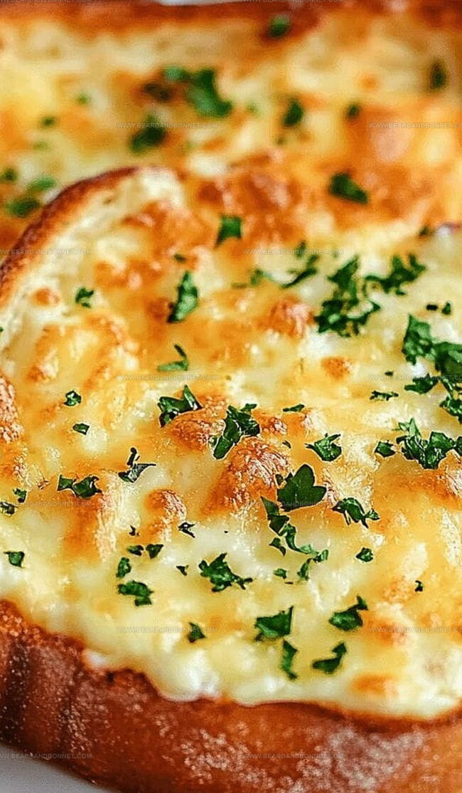 Serving Presentation: Extract the cheesy toast from the oven, allowing a brief cooling moment before serving, revealing a crisp, golden base topped with molten, herb-infused cheese.