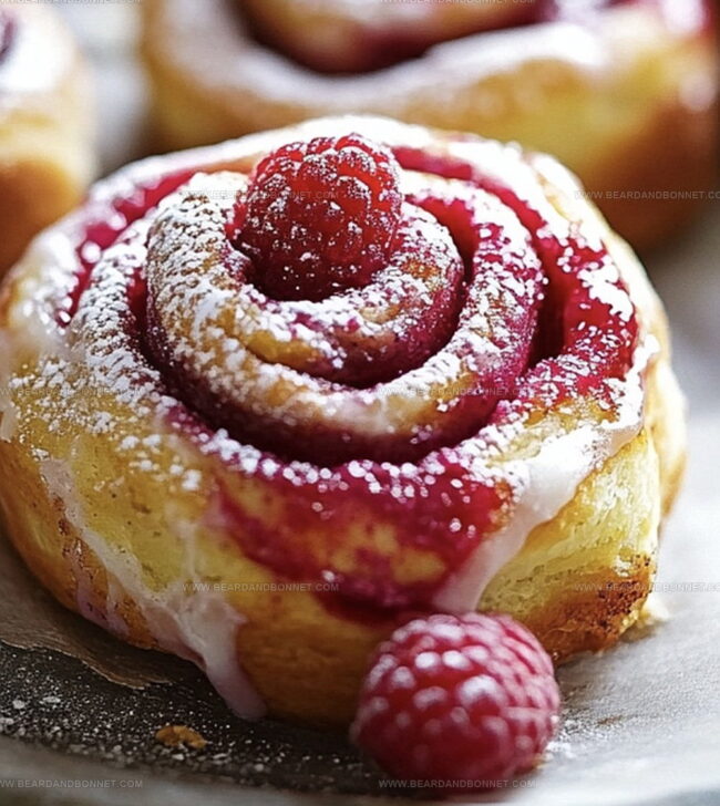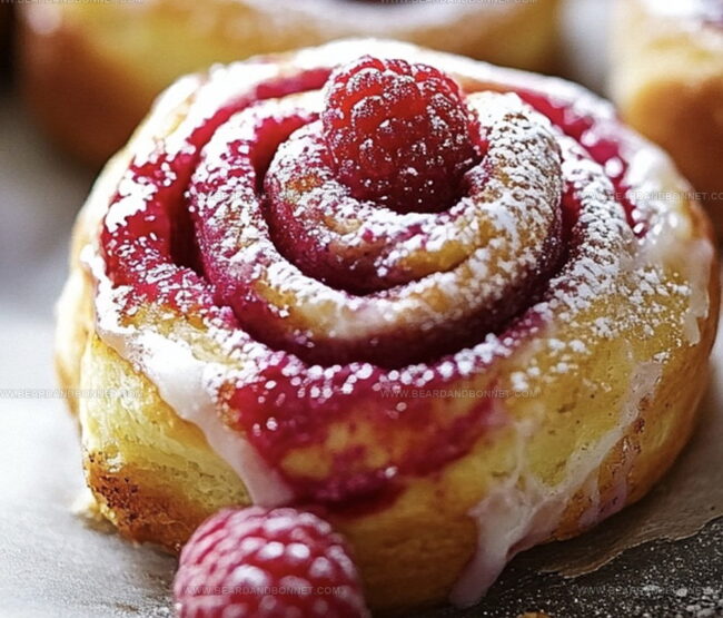 Stretch dough into a wide rectangle. Spread softened butter across surface. Generously scatter raspberry mixture, leaving small edges clear. Carefully roll dough into a perfect spiral, then slice into delectable rounds.