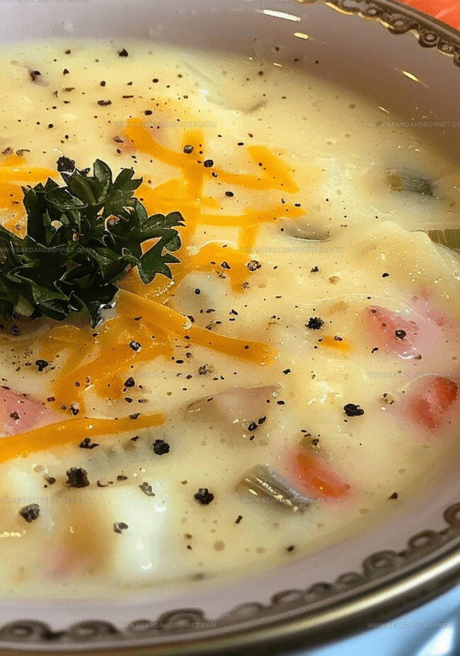 Garnish Galore: Sprinkle fresh chopped chives, green onions, or parsley on top for a burst of color and added freshness that enhances the soup’s rich, cheesy flavor profile and provides a delightful textural contrast.