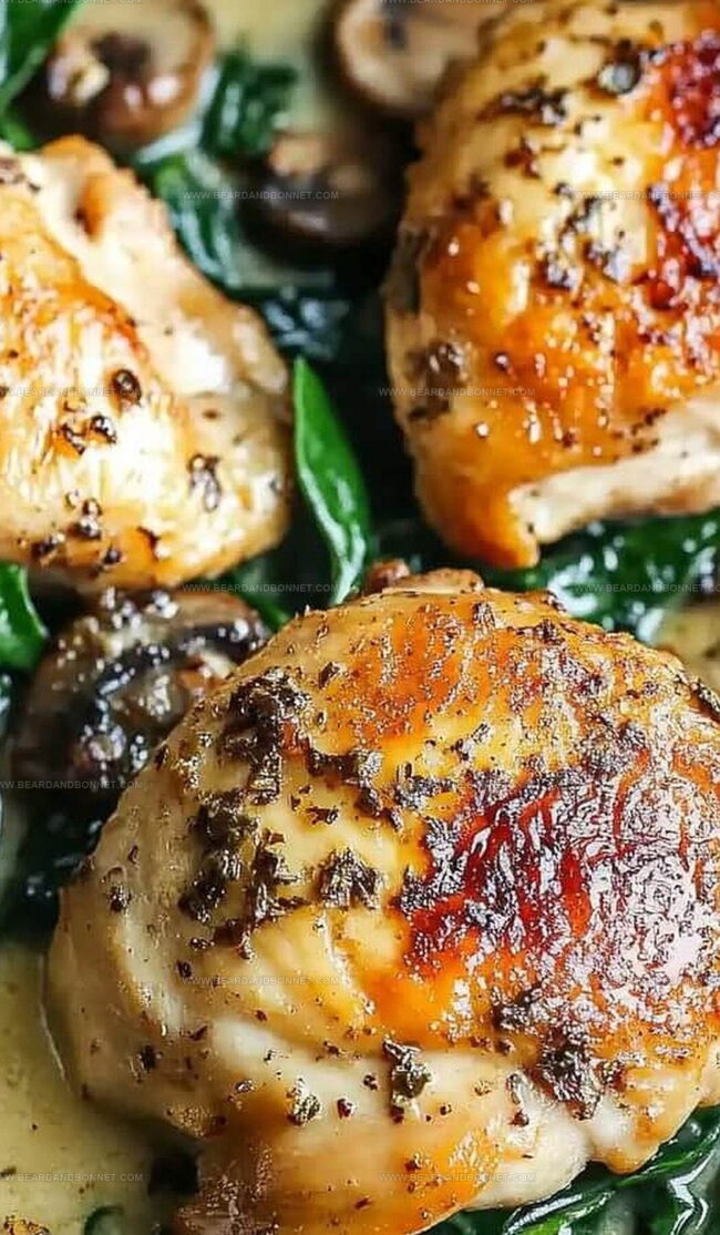 Tender chicken breasts nestle among earthy mushrooms and vibrant spinach, creating a harmonious blend of textures and tastes.