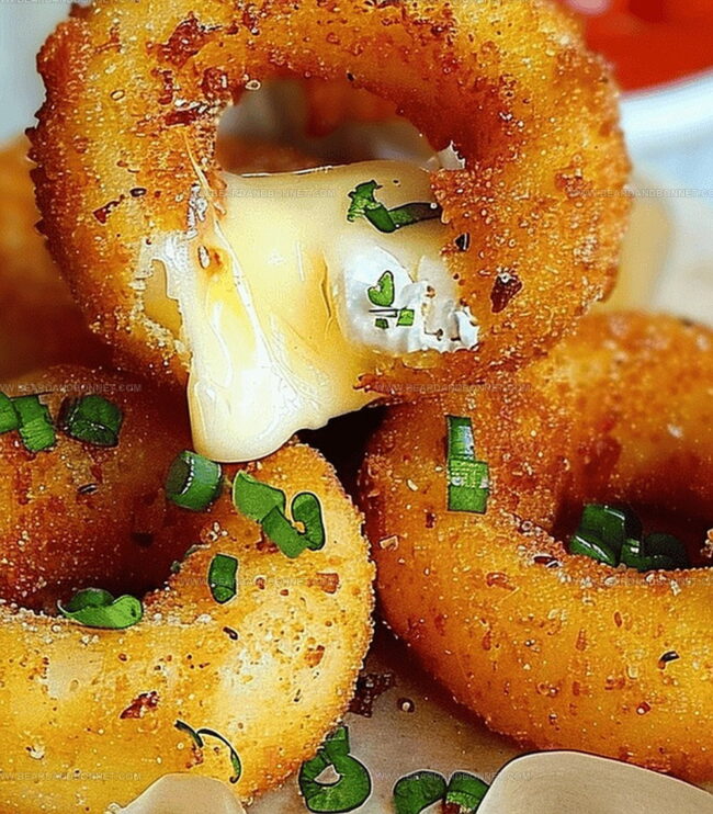 Crispy mozzarella stick onion rings blend two beloved appetizer classics into one irresistible golden-brown indulgence.