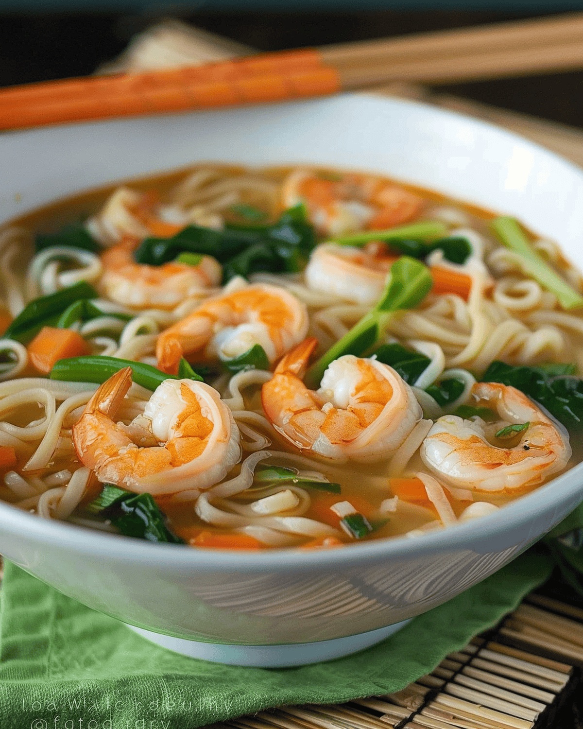 - Ladle the steaming soup into serving bowls, ensuring each portion contains a balanced mixture of noodles, vegetables, and succulent shrimp.