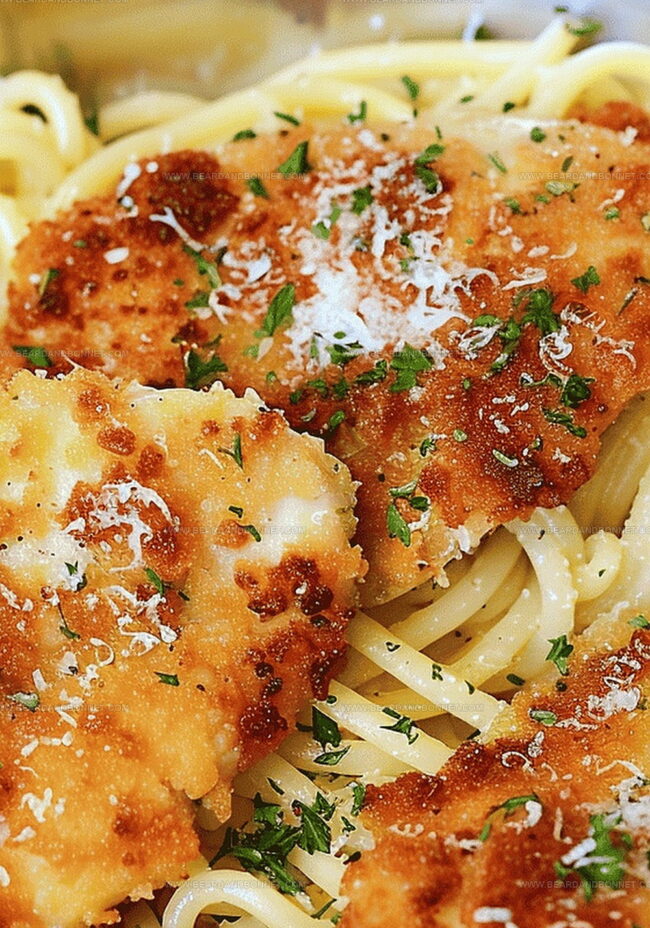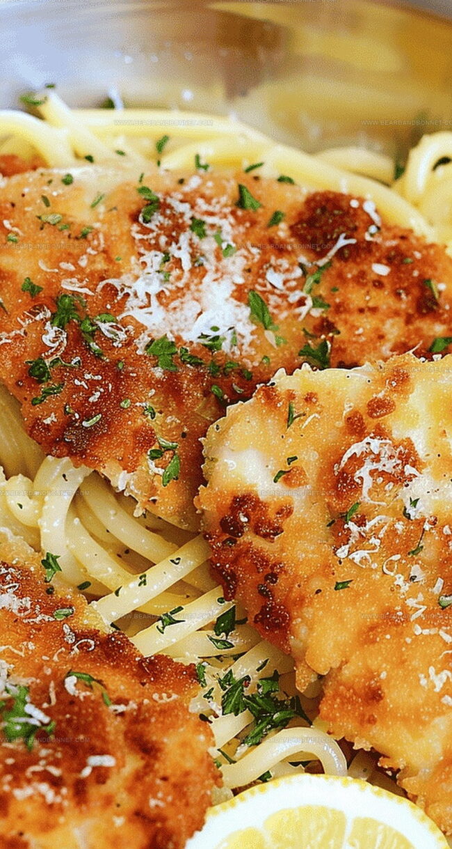 - Plate by placing lemon garlic pasta as a base and topping with crispy Romano chicken cutlets.