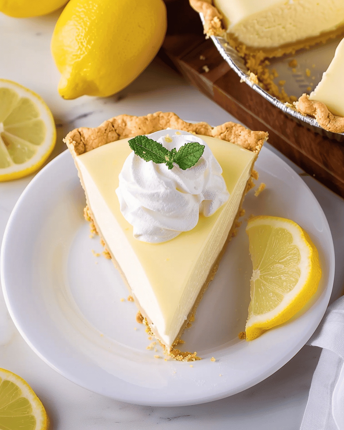 Once chilled, crown pie with delicate whipped cream, zesty lemon slices, and optional fresh mint for a stunning finale.