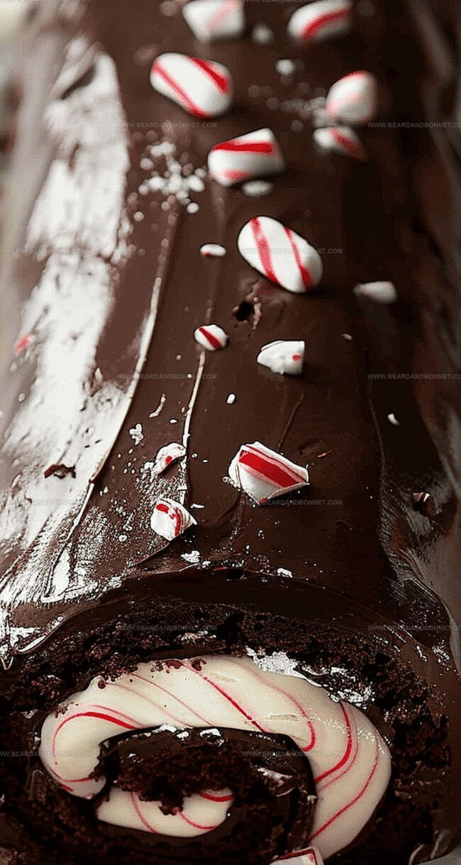 Festive Holiday Centerpiece: Transform this decadent roll cake into a show-stopping dessert by garnishing with candy cane pieces, fresh mint leaves, and a light dusting of powdered sugar for a stunning holiday presentation.