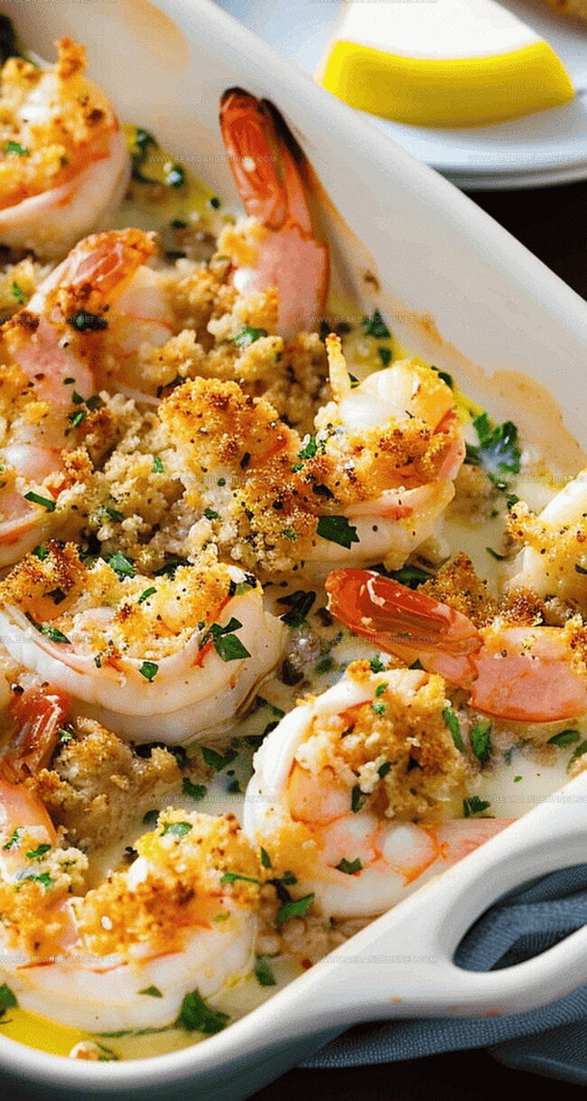 Flavor Layering Generously scatter the seasoned breadcrumb mixture over the shrimp. Carefully pour wine and chicken stock around the seafood, preserving the crispiness of the topping. Dot with butter cubes and drizzle olive oil for extra richness.
